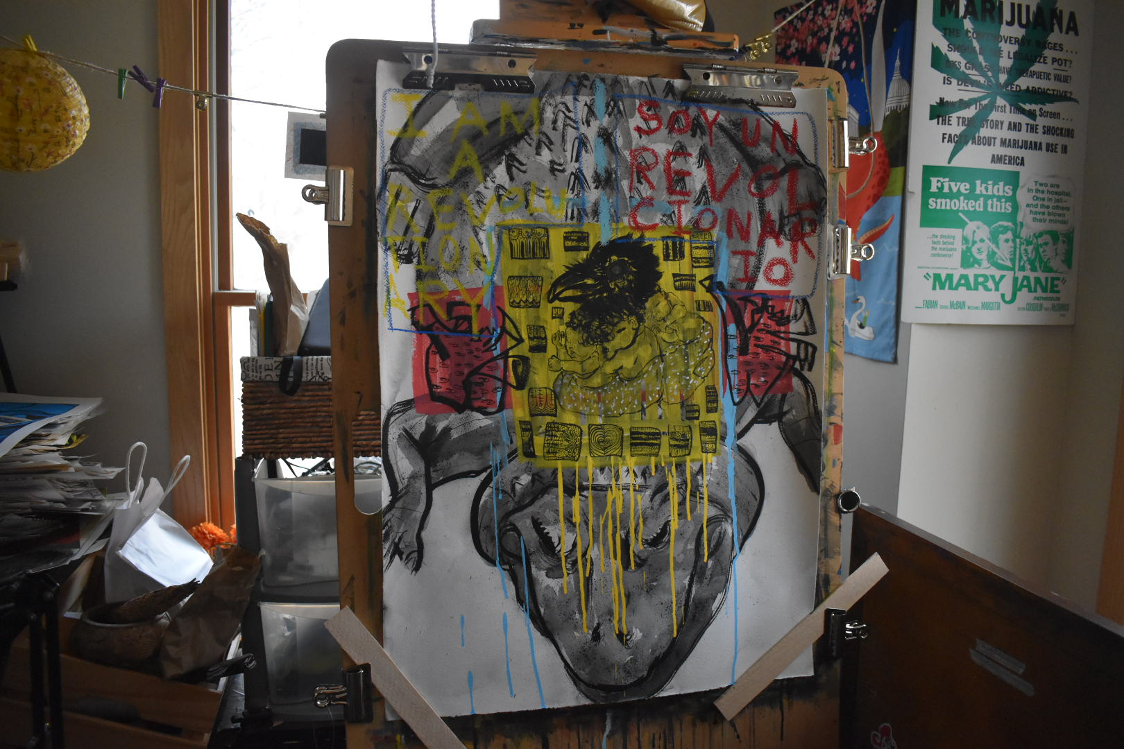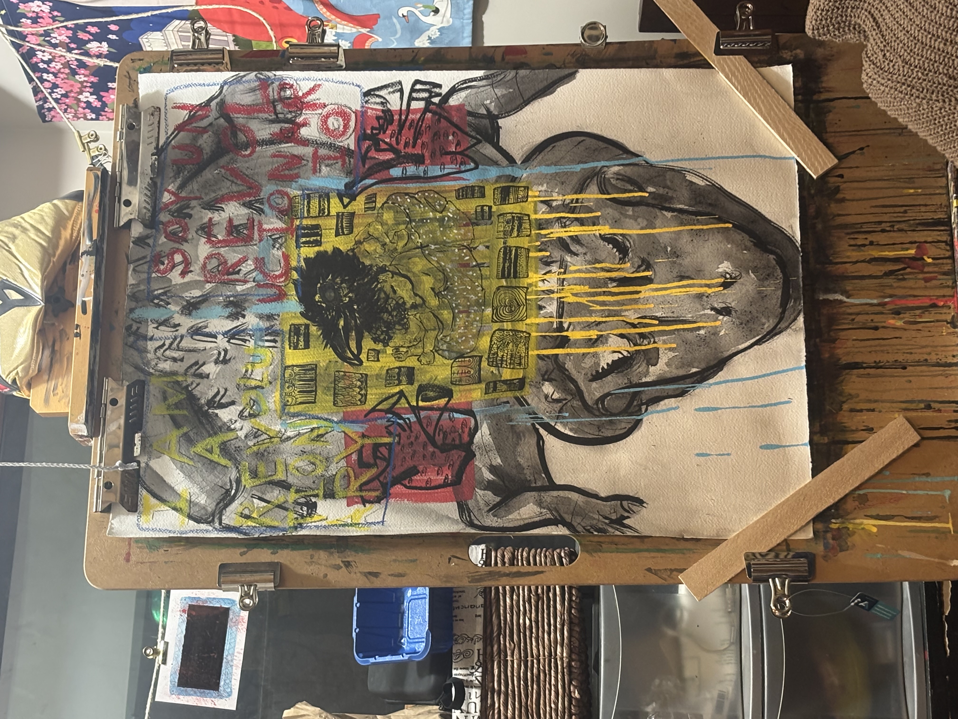 In this powerful and emotive mixed-media piece, vibrant hues of yellow, red, and blue converge with bold strokes of sumi black ink. "Children's Keeper" is a poignant exploration of defense and protection, conveyed through a complex interplay of textures and colors.